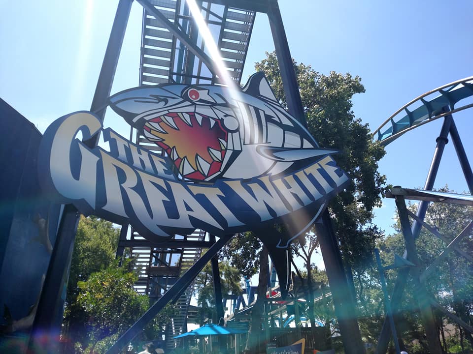 Since it was July, it was very hot at the park. Luckily we found the Chill Out Bar located next to the Great White roller coaster. The bar offered liquid nitrogen frozen ice cream and a number of cool adult beverages including frozen Jack & Coke. The best part of the bar is that you get to keep the cup that your drink is served in when you’re done! Oh, and it’s one of the few places in the park that serves drinks with straws. The straws are paper, though, and completely biodegradable.