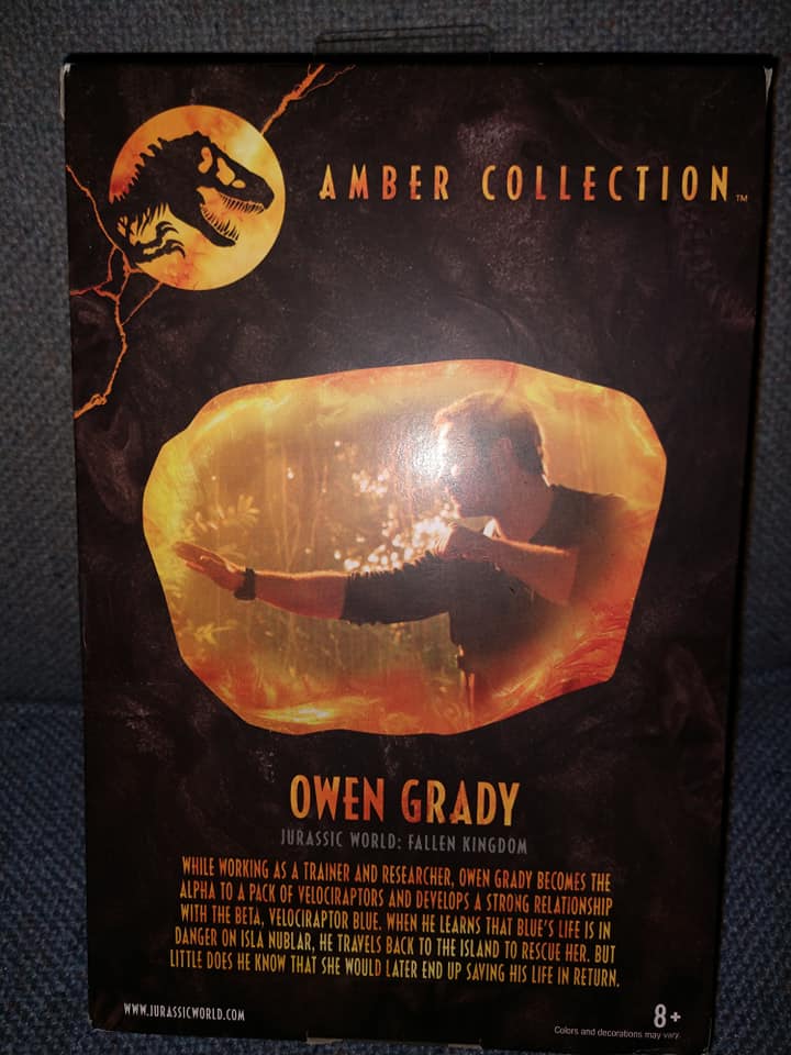 The box is actually quite nice. It features a brief description of Owen on the back and relief images of dinosaur bones, amber with a mosquito in it, and the Jurassic World logo on the side.