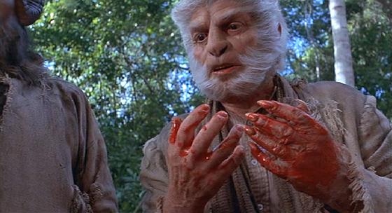 The creatures are guided by the Sayer of the Law (Richard Basehart) who repeatedly recites the three laws taught to him by Moreau. Those laws are 1) No Walking On All Fours, 2) No Eating Of Flesh and 3) No Taking Of Life. Despite knowing the laws, many of the creatures find it hard to resist their natural animalistic instincts and a couple of them give in to their desires. One of them attacks Braddock and is sent to Moreau’s house of pain for treatment. The other one, Bull-Man (Bob Ozman), attacks and kills a tiger. Moreau attempts to have him brought in for treatment, but Bull-Man escapes and is wounded. When Braddock catches up to him, Bull-Man asks Braddock to kill him, ending his miserable existence. Braddock complies and sends the rest of the creatures into a frenzy.