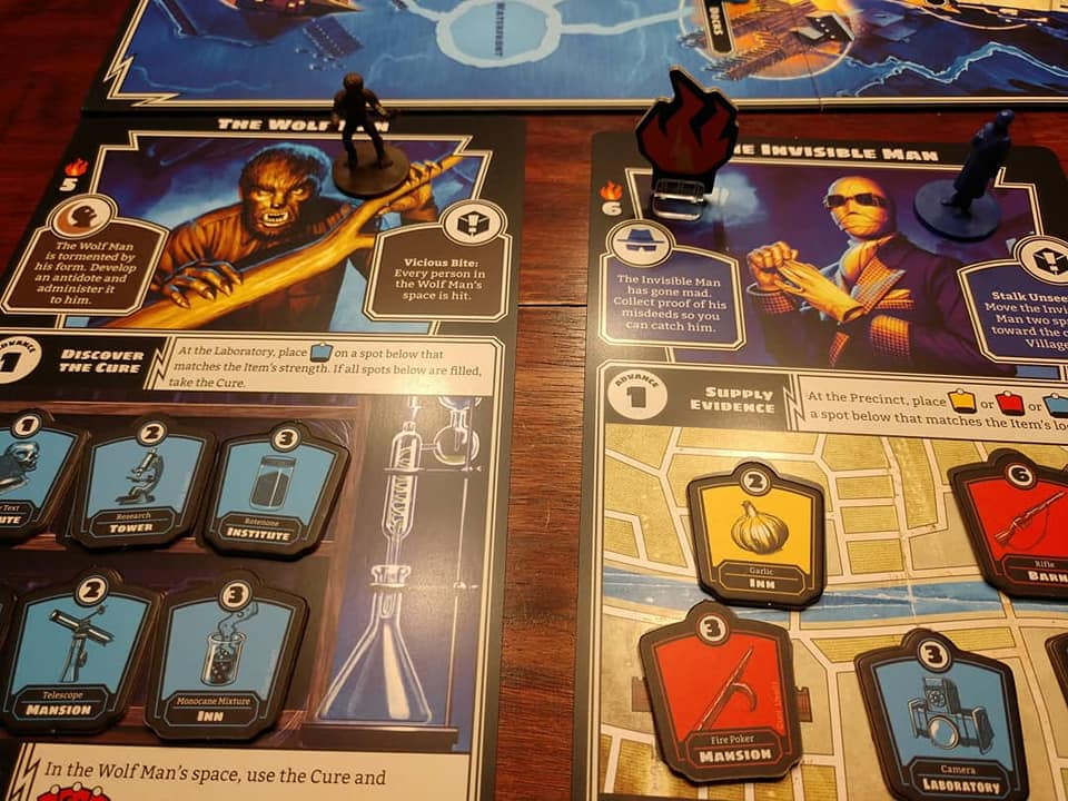 If you’re unfamiliar with the classic films and their monsters that this game is based upon, you’ll have a really fun time teaming up with friends to defeat the monsters and save the village. If you are a fan of Universal’s beloved monsters, you’re going to have an awesome time! There are tons of hints, nods, winks, and Easter eggs from many of the films. They begin as soon as you open the box and look at the folded board.