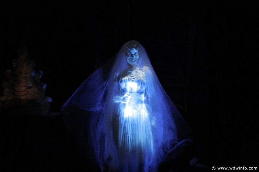 The buggy takes us through the rest of the mansion. It features numerous animatronic ghouls and ghosts, projected images (including a breathtaking ballroom full of dancing ghosts), eerie music, and tons of spooky sound and light effects.