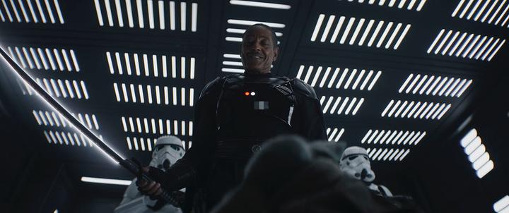 Basically, Boba Fett beats the crap out of a ton of stormtroopers and Fennec helps him while Din attempts to break into the Force force field surrounding Grogu. As the battle continues, Din is distracted by the stormtroopers and eventually loses Grogu to four Dark Troopers sent down by Moff Gideon (Giancarlo Esposito) to retrieve him. To top it all off, Gideon has Din’s ship, the Razor Crest, disintegrated on the spot, leaving him only the Beskar spear that he earned in the prior episode. Boba Fett and Fennec Shand agree to help Din save Grogu and the Mando also enlists the aid of Cara Dune (Gina Carano) in order to bust another returning character, Migs Mayfield (Bill Burr), out of prison.