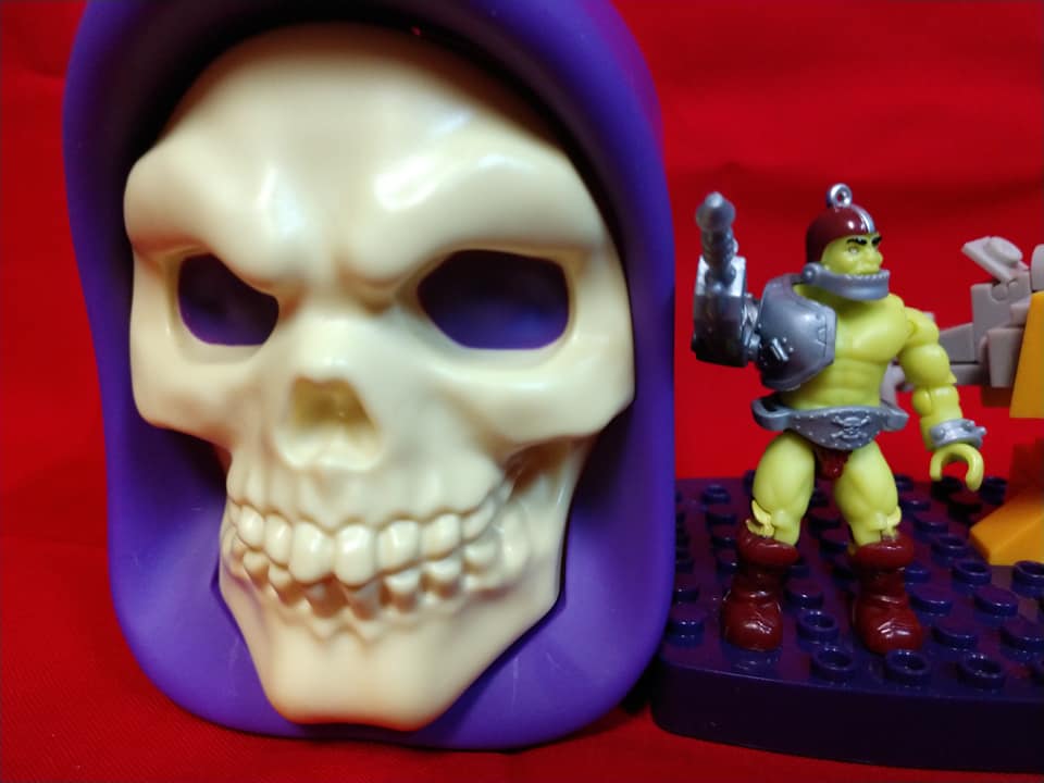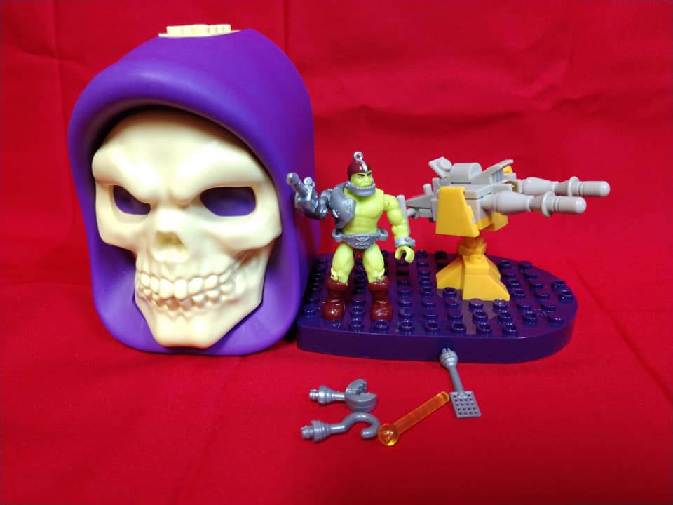 The Trap Jaw set that I am reviewing today is fun from the word go. It’s a simple build with only seventy-six pieces, but it’s a great little build that adds to the growing Mega Construx MOTU line. What I love best about this build is the container. It’s literally a small Skeletor head that’s jam-packed with all of the pieces for the build. There are three Skeletor heads in the line so far, with one being the traditional head with a purple hood, a second head that has a purple hood with a glow-in-the-dark face, and a final head that features a black hood and a golden Skeletor face. Each set features a different figure: Trap Jaw, Fisto, and He-Man.