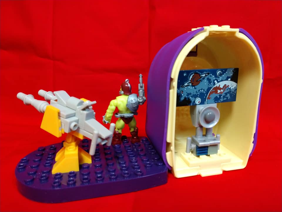 The set also includes a laser turret cannon and a control center complete with a monitor. The cannon can turn side to side and be angled up or down. It features a firing laser with two laser bolts. The control center’s monitor includes a view of a planetary system. The turret cannon can be placed on the purple display platform along with Trap Jaw and the control center tucks nicely into the back of Skeletor’s head.