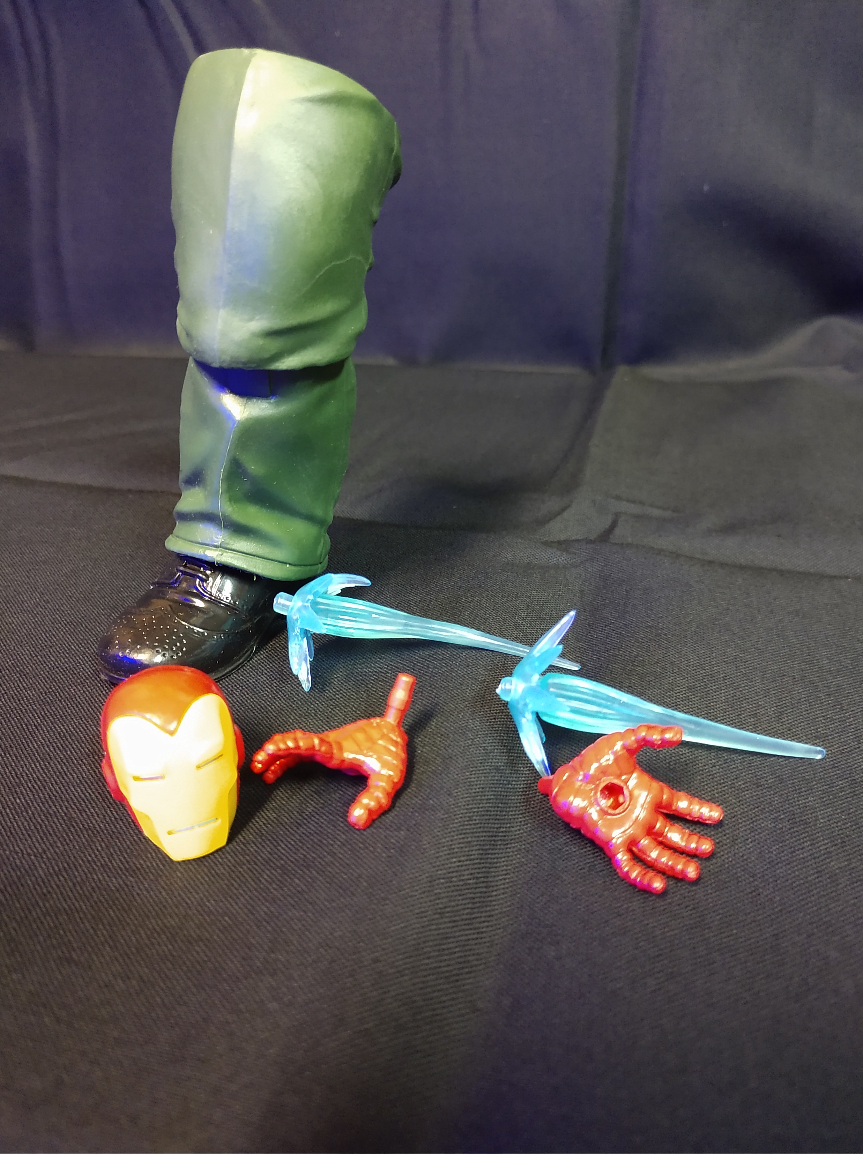The figure comes with five accessories and Mr. Hyde’s right leg. The accessories are two pulses fired from Iron Man’s hands, two open firing hands, and a helmet. The pulses look pretty nice when attached to the firing hands. The hands don’t look so great without the pulses as they simply have a hole in the middle of them. The helmet looks great but, as I stated before, it defeats the purpose of showing off an A.I. Tony Stark.