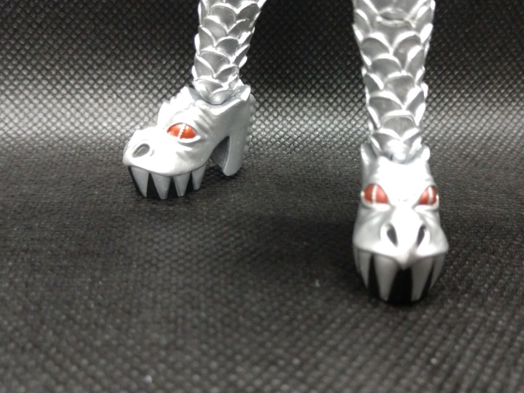 Despite having twenty two points of articulation, the figure has posing issues. The wings get in the way of posing Gene and they easily pop off of the figure. The wings also prevent posing Gene in his iconic “bass straight up and down” pose. On the Destroyer tour, Gene had fabric wings that could be disconnected at the wrist. I honestly believe that detachable soft goods wings would have been a better option for this figure. Perhaps it would have affected the price point which currently sits around fifteen bucks, but the hard plastic detachable wings on this figure really bother me. Also, the legs are pretty stiff as are the arms. This is a good thing if you plan on posing the figure once and leaving him as is, but I plan on changing up his look once I get my hands on some of the upcoming figures in this line. One final complaint, and it’s minor but noteworthy, is the fact that the photo on the box appears to be of Gene from the Reunion tour and not a photo from the original Destroyer tour. I’m being nit-picky here, but I thought that I should bring it up for hardcore KISS collectors.
