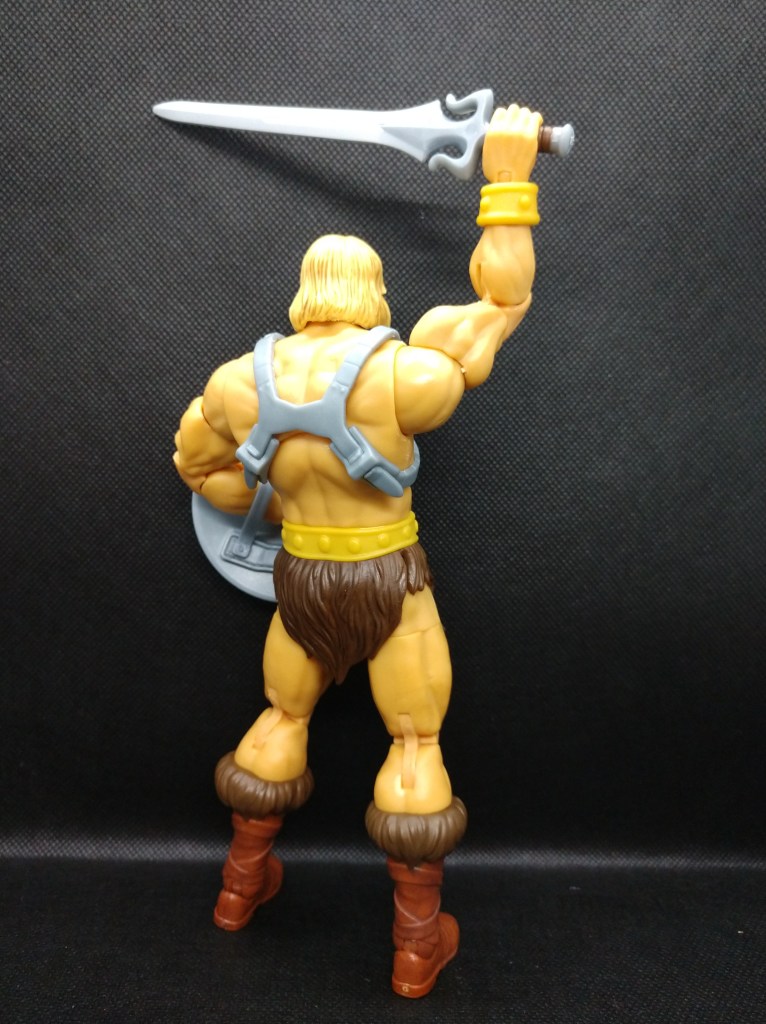 The figure comes with two sets of hands (one pair gripped for accessories, one closed fist, and one open hand suitable for slapping Skeletor), the Sword of Power, He-Man’s iconic shield, and a bracer that fits over his left forearm. The bracer can be removed and the shield will easily slide over He-Man’s left arm. Use the “slapping” hand to hold it in position (at least in my opinion). The shield does fit a bit loose, but if you tuck He-Man’s arms up, the shield will stay in place.