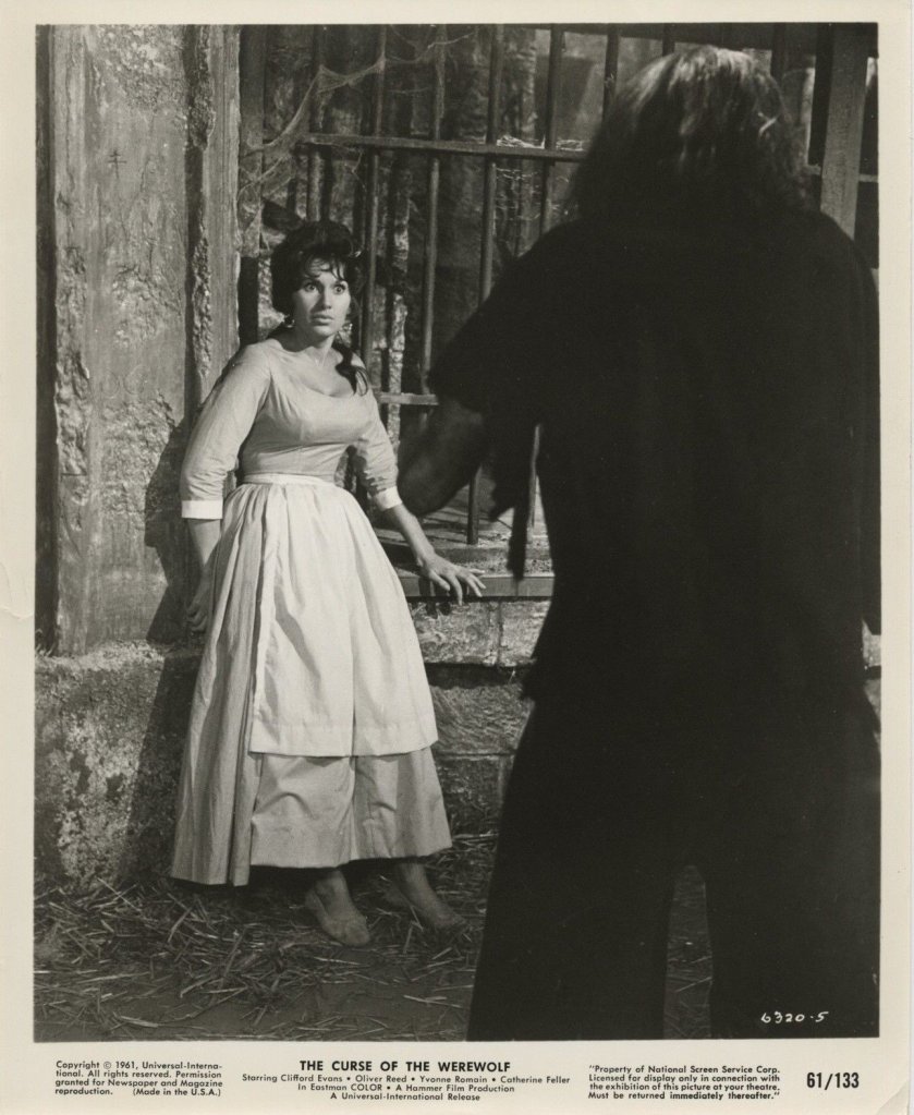 The cast was also excellent. Oliver Reed took command of every scene that he was in and dominated the movie despite not appearing in it until about forty-five minutes into the film. His bulging eyes grabbed your attention and his fur-covered barrel chest made his werewolf look particularly imposing. Clifford Evans and Hira Talfrey were excellent as Don Alfredo and Teresa. Catherine Feller also did a great job as Cristina. Yvonne Romain was simply ravishing as the mute jailer’s daughter. I found it a little funny that many of the film’s promotional shots feature Oliver Reed’s werewolf interacting with Yvonne Romain despite her being Leon’s mother in the film and never seeing him as an adult nor as a werewolf. I’m pretty sure that the Hammer and Universal were cashing in on Romain’s stunning looks to bring in crowds, though, and that’s why she’s featured in so much of the promotional material. Anthony Dawson was wickedly fun as the Marques. I also enjoyed Richard Wordsworth’s performance as the beggar who becomes insane in prison and rapes the poor jailer’s daughter.