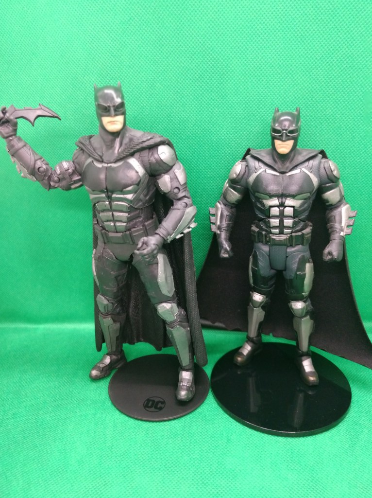 Above is a comparison shot of the 2021 version of Batman versus the 2017 Mattel Justice League Batman figure. The 2017 figure has brighter colors and more paint apps. The goggles are silver whereas the McFarlane figure keeps almost everything black. The Mattel figure is noticeably smaller than the 2021 figure as well. When comparing the capes, you can easily see that the Mattel cape has curled up over the years. The soft plastic cape on the 2021 figure looks like it will remain in place. There’s simply no comparison when it comes to articulation. The McFarlane figure easily beats out the Mattel figure in that aspect. Overall, the McFarlane figure is a major improvement over the 2017 figure, but that figure will always hold a special place in my heart.