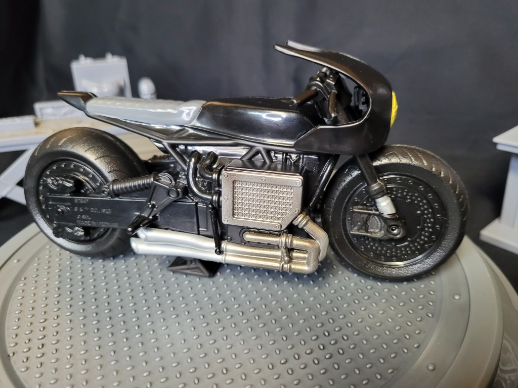 The Batcycle looks cool and is very similar to the one featured in the film. It’s a slick looking bike and it look great on its stand. It features a kickstand that prevents it from falling on its side. The best thing about this bike to me is the fact that Batman can actually sit on it without any difficulties or awkward posing. This is one of the first Spin Master vehicles that I’ve found that actually fits their action figures properly.