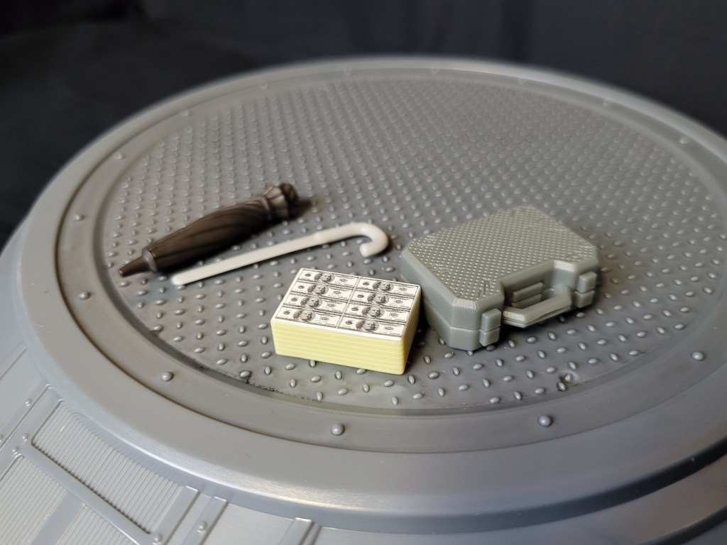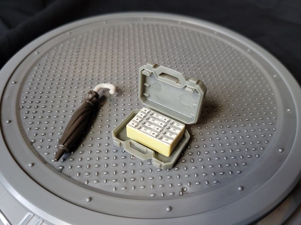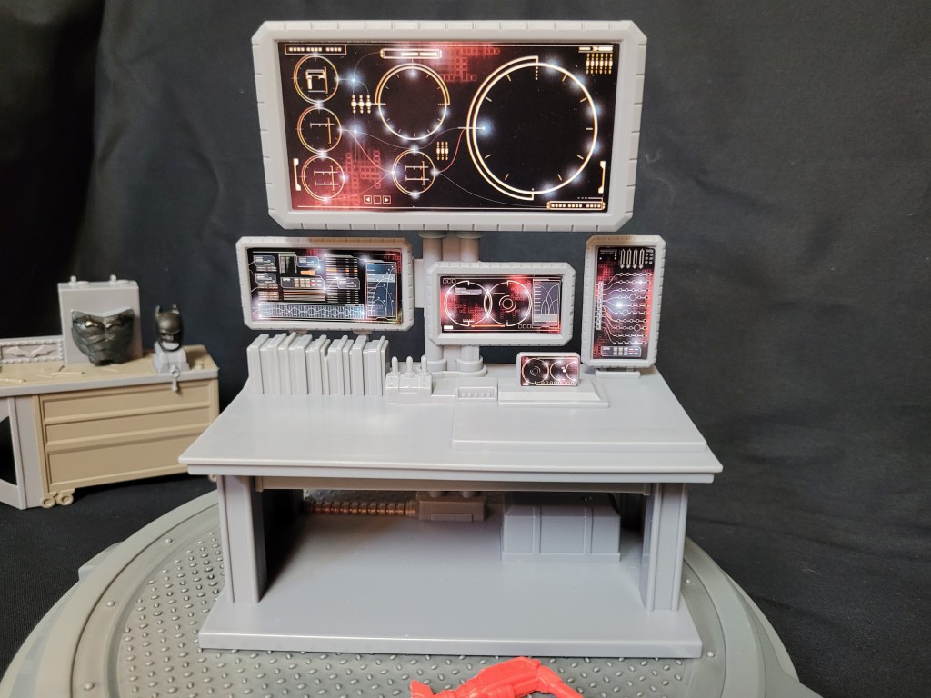 This is definitely the biggest play set that I’ve ever personally reviewed from Spin Master. It comes with quite a few pieces. There’s the Batcave stairwell that must be assembled (two sets of stairs and the walkway snap together), a multi-screen computer desk, a work bench with places to store the included cowl and chest plate, the Batcycle, a red grappling gun, two Batarangs, a suitcase that opens, cash that can be stored in the suitcase, the Penguin’s umbrella with a blade that can be hidden in the handle, and two figures, an unmasked Batman and the Penguin. There’s also a parking stand for the Batcycle. I plan on using it in the future to display pretty much all of my Spin Master stuff as I review it.