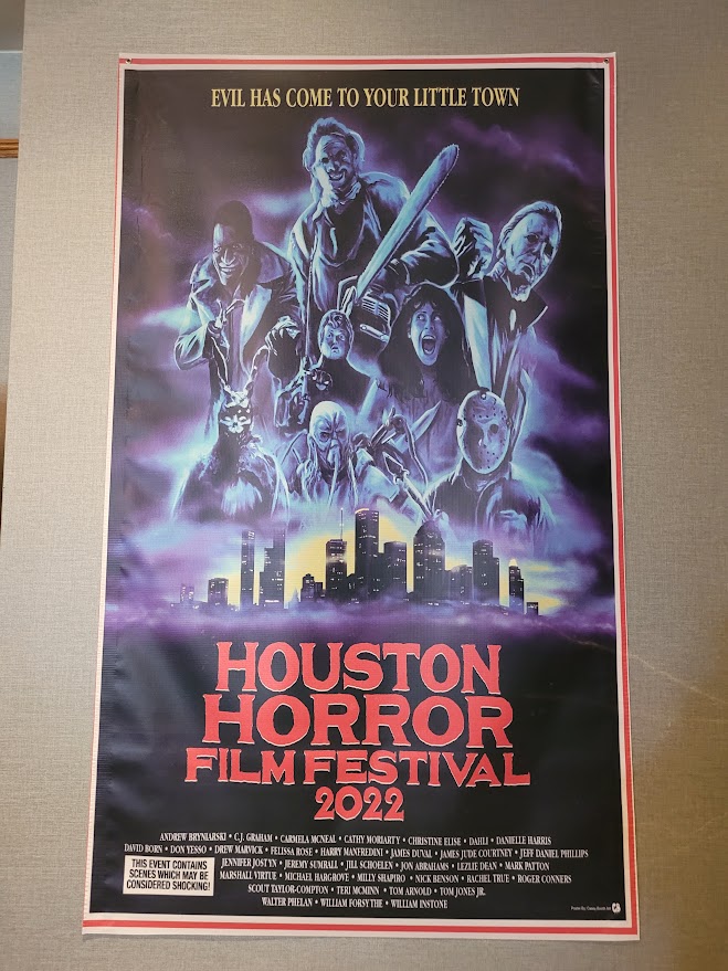 I ventured a few hours into the Lone Star State on Saturday, July 23rd, to attend the Houston Horror Film Festival for the first time. Thankfully it took place at the Westchase Marriott, a hotel that I attended another event in a few years ago. That came in handy, as I was already familiar with the layout of the property. Once I arrived I headed to the back of a very long (but swiftly moving) line to pick up my wristband.