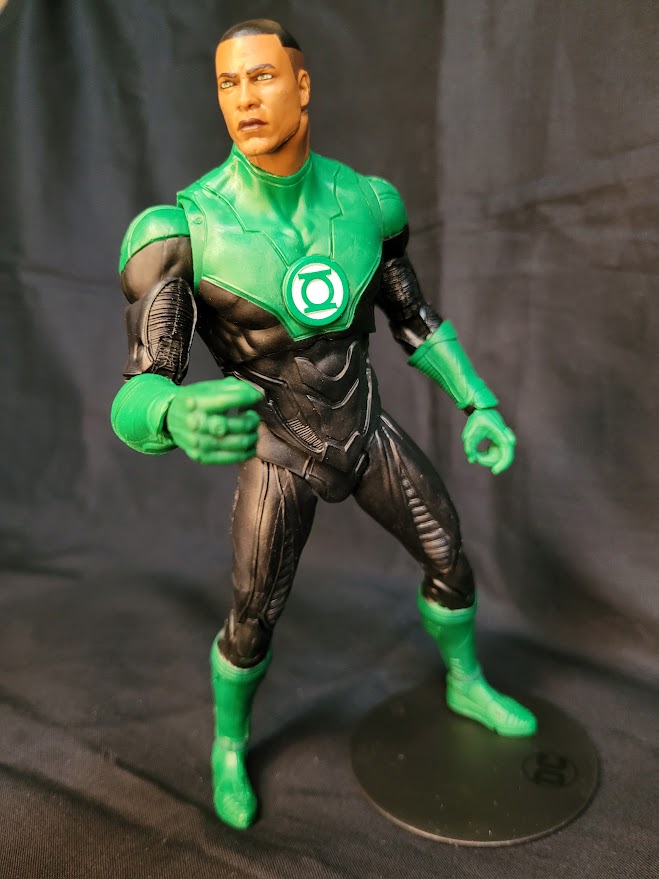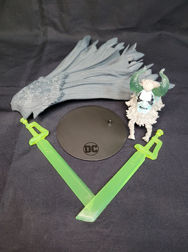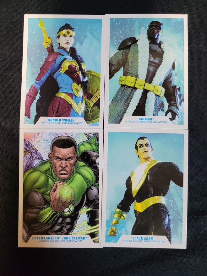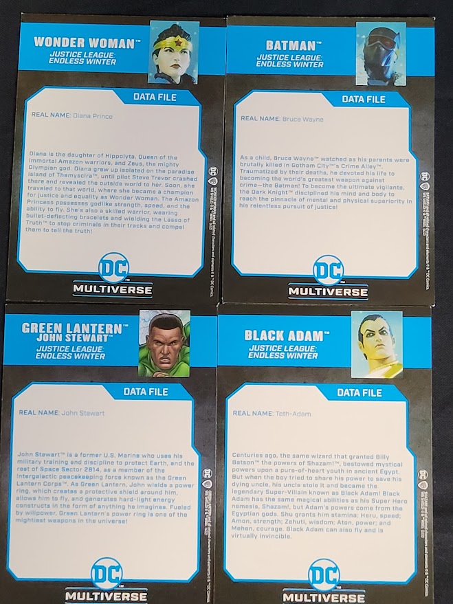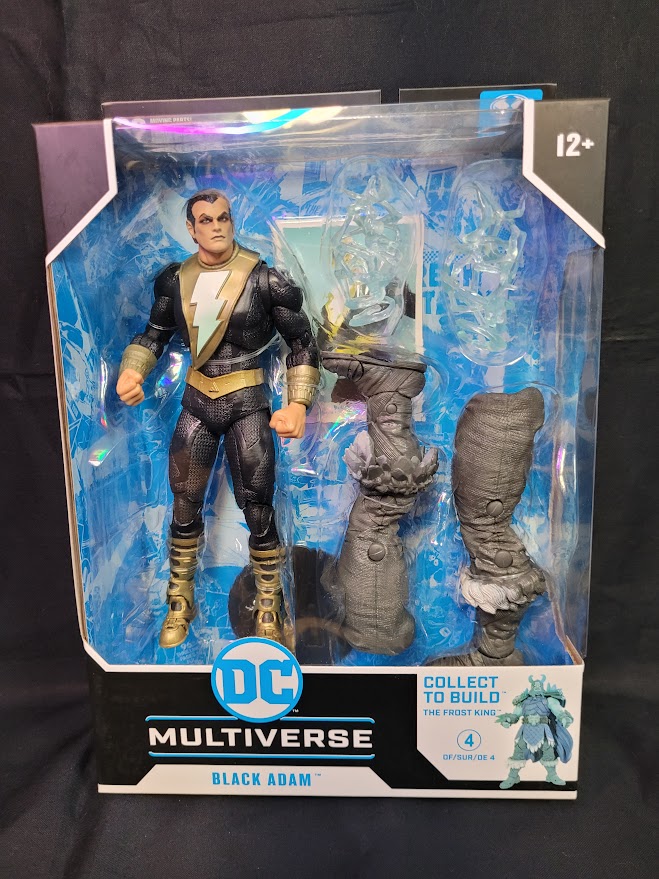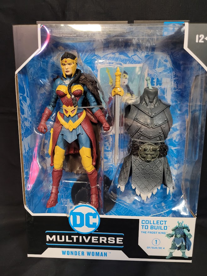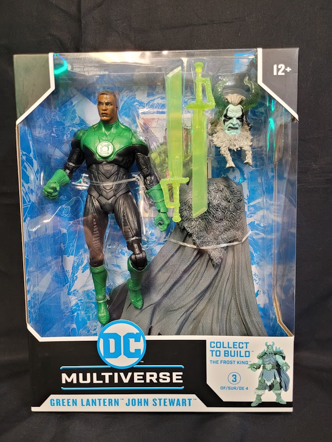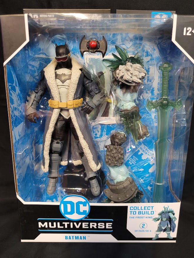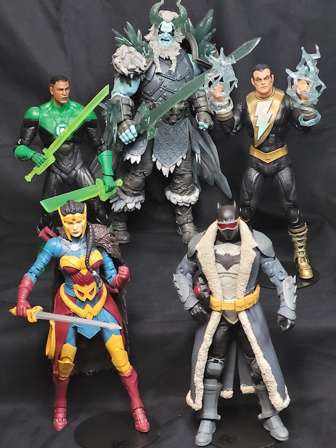 DC Comics’ December 2020 tale about the Frost King comes to life in the recent McFarlane Toys DC Multiverse Endless Winter Build-A-Figure line. The full line consists of five seven inch figures and one Build-A-Figure figure of the Frost King. The lineup is composed of Wonder Woman, Green Lantern (John Stewart), Black Adam, Batman, and Aquaman. Only four of the seven inch figures in the line come with pieces used to assemble the Frost King. Aquaman is the odd man out in the line. Each figure comes with accessories, a DC figure base with a peg, and a collector card. For this review I will only be focusing on the four figures that come with pieces to build the Frost King and the fully constructed Frost King figure. I’ll review Aquaman in a later review.