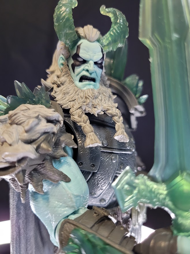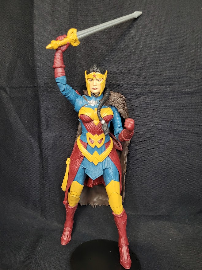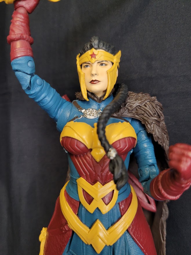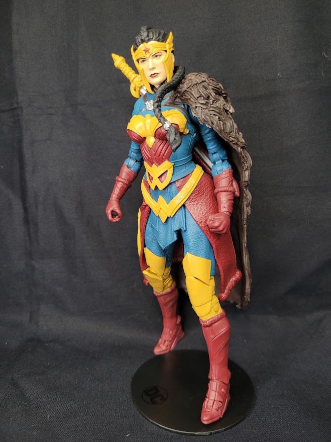 Wonder Woman looks amazing in this line. She features amazing details, especially in her cloak. She has a long braid that falls across her left shoulder. Her armor has excellent detailing and the paint apps are nice albeit a bit basic. Her lasso of truth is also here, but as a molded piece of her skirt and it is not removable. She comes with a sword and a sheath that the sword can be placed in if you so choose. She also comes with the torso of the Frost King BAF. Unfortunately for this figure, the amazing attention to detail by McFarlane hinders the articulation of this figure. Wonder Woman is very limited by her cloak and armor. That being said, she looks amazing on display.