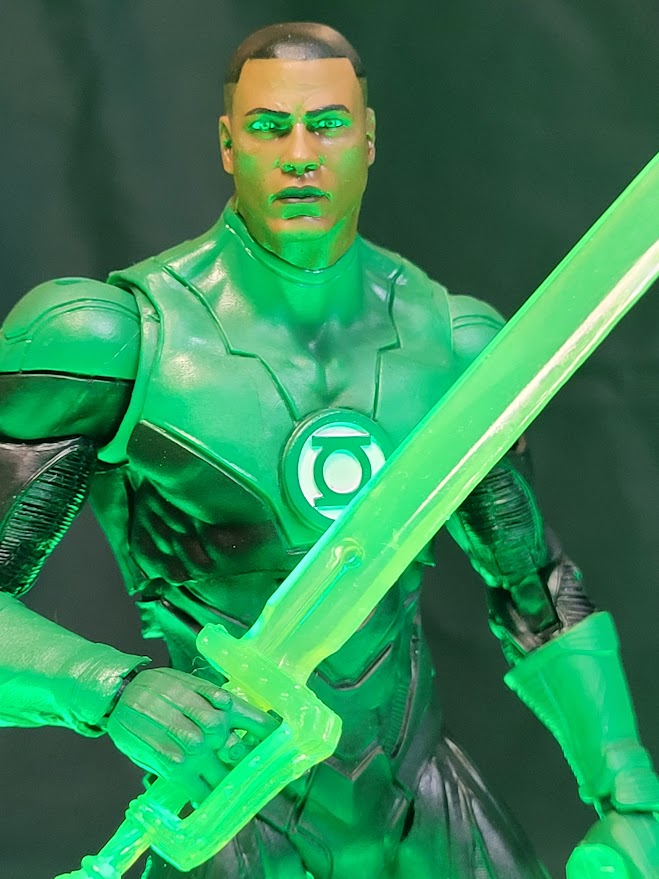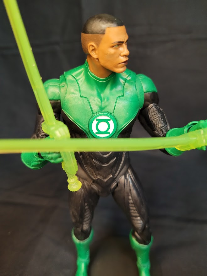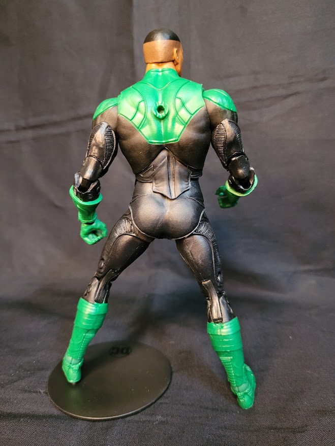 Arguably the most posable figure in this review, the John Stewart version of the Green Lantern is also the leanest and meanest designed of the bunch. He’s also oddly light and feels a bit cheaply made. The black and green paint apps on the suit look excellent and the overall details in the figure are very good. He’s only slightly limited at his shoulders as far as articulation goes. My specific figure that I purchased features some slightly loose leg joints at the knee and hip. Green Lantern comes with two green sword constructs and the head and cloak of the Frost King. He doesn’t come with a flight stand which is a bit disappointing. He also has a peg in the center of his shoulder blades that doesn’t seem to serve any purpose whatsoever. Despite these flaws, he looks great on my shelf.
