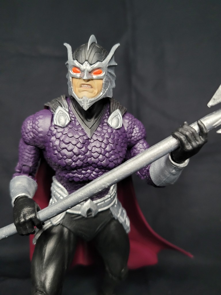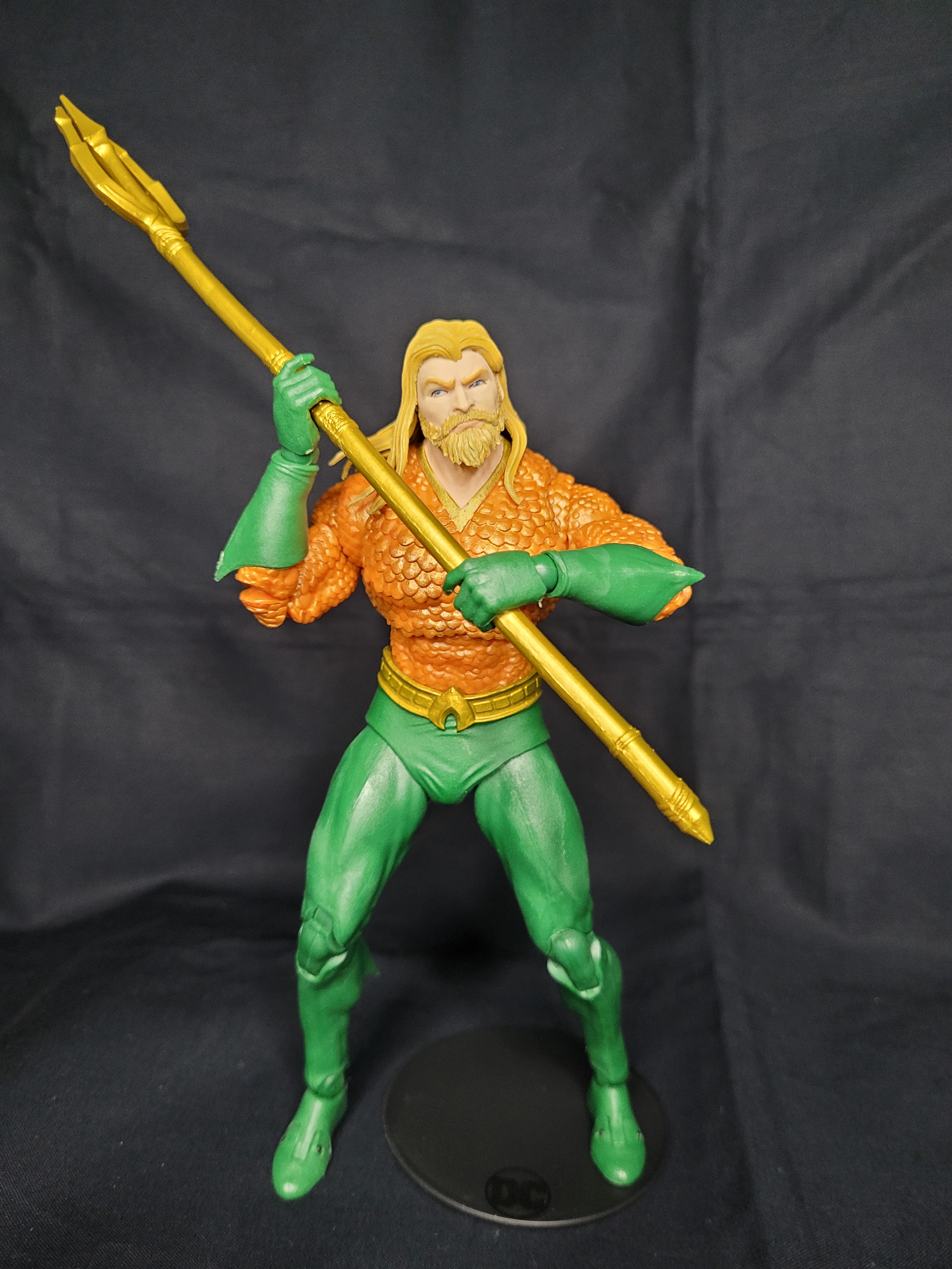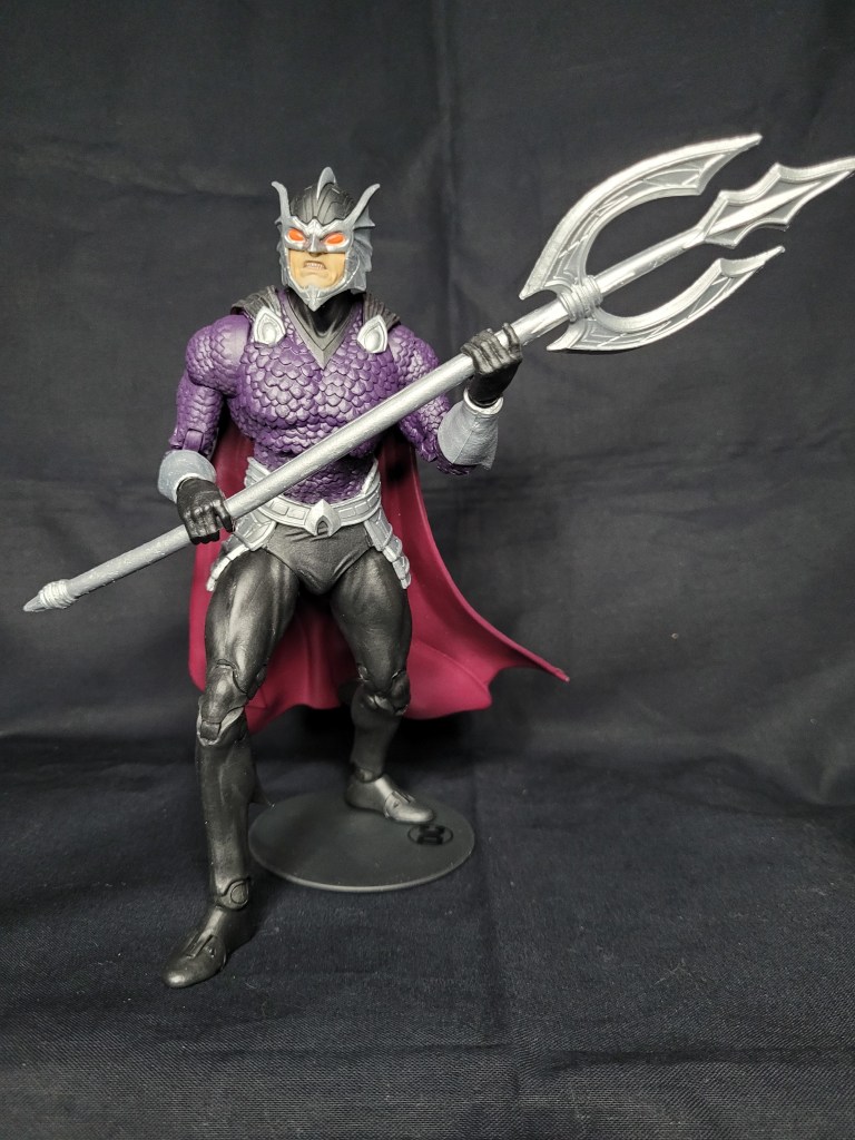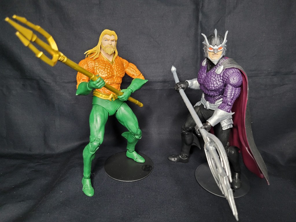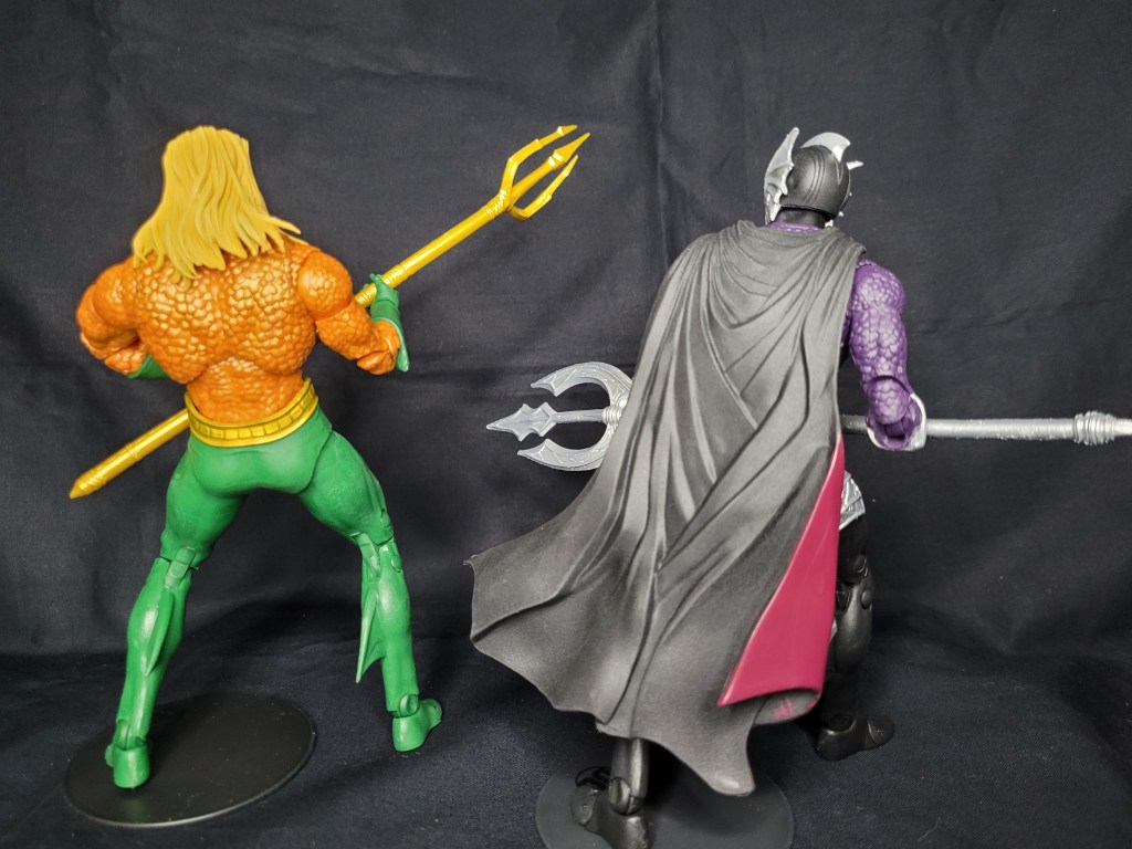 As is often the case with McFarlane Toys, the accessories with these figures is pretty limited. Each come with a standard DC figure base and a collector card. The also each come with their trademark trident staffs. Both figures also feature some great paint apps and bright colors. Aquaman’s orange and green suit looks great and his traditional golden locks look amazing as well. I’m also a huge fan of Orm’s look as well. His purple and black suit looks just like the one featured in the New 52 DC Comics run and the regal/imperial purple interior of his cape is just as wonderful as the interior on the recent DC Rebirth Batman figure by McFarlane Toys.