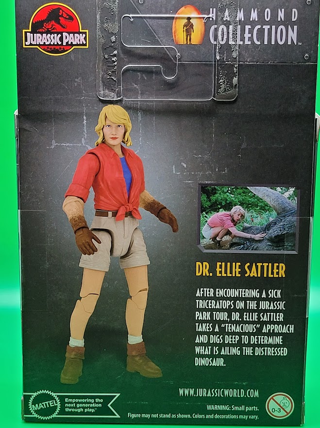 Dr. Ellie Sattler (as portrayed by Laura Dern) is one of my favorite characters from the Jurassic Park franchise. The character is great on the screen and in the books. Plus, having a massive crush on Laura Dern and seeing her in her field research outfit in the original film didn’t hurt my opinion of the character! Until recently I never acquired any collectible items featuring Dr. Sattler from the franchise but that all changed whenever I found Mattel’s The Hammond Collection Dr. Ellie Sattler 3.75″ Action Figure on clearance.