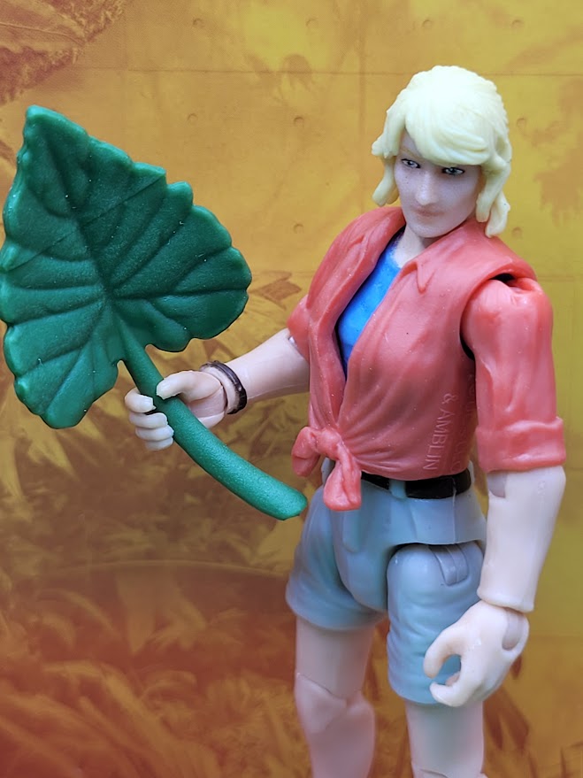 The Hammond Collection 3.75″ Dr. Ellie Sattler figure is pretty decent. The likeness to Laura Dern is okay but not great. They nailed her suit from the film. I counted seventeen points of articulation on the character and she comes with peg holes in her feet for stands. As far as accessories go, Dr. Sattler comes with a massive leaf from a veriforman plant (the one she nabs while riding in the Jeep after initially arriving at Jurassic Park) and a second set of arms that allow you to recreate the “That is one big pile of sh!t,” scene featuring Dr. Sattler digging deep into the poop of a sick triceratops. The arms feature the poo-covered rubber gloves that Dr. Sattler puts on before doo-doo diving to find out that the dino’s illness is a result of consuming West Indian lilac and, yes, I initially believed that the leaf that comes with the figure was West Indian lilac. I totally forgot about the early leaf grabbing scene. In case you are wondering, Dr. Sattler can’t hold anything with the poo hands but her standard clean hands can hold the included leaf.
