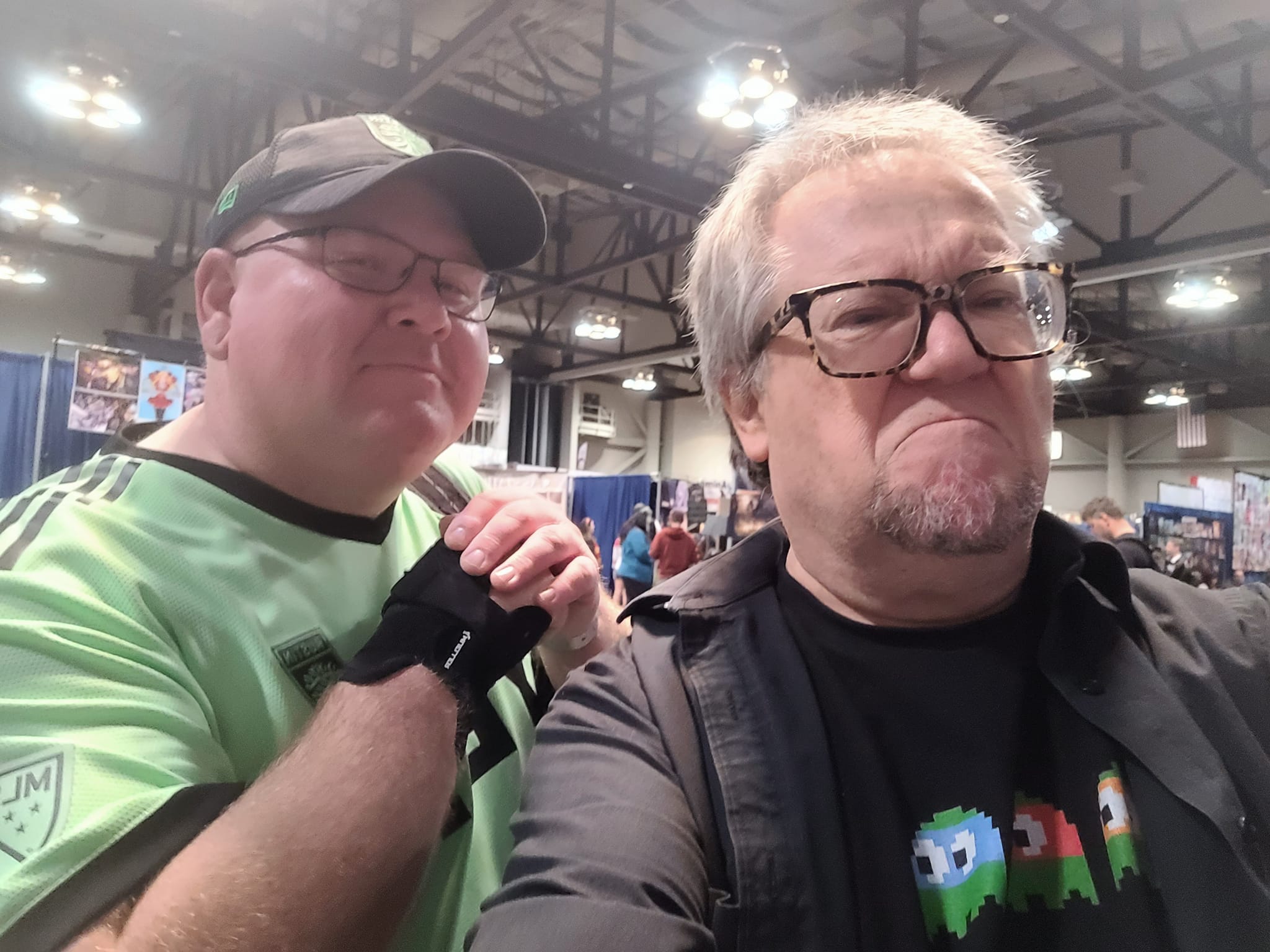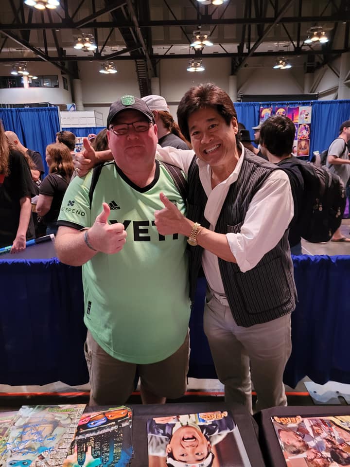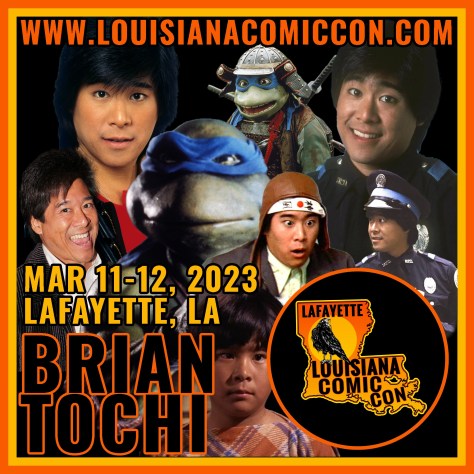 I spent much of my free time catching up with old friends, many of whom I haven’t talked to in person in years. I also made two new friends, Henry and Dexter, as we teamed up as the Scream Kings for a trivia game against Loki. We managed to win first prize, free Louisiana Comic Con tees, and became fast friends over our love of horror films. I was also fortunate enough to meet Brian Tochi and Robbie Rist. Mr. Tochi appeared in the Police Academy franchise and Revenge of the Nerds. I was there primarily because he was the voice of Leonardo in the original Teenage Mutant Ninja Turtles films. Mr. Rist is perhaps best known as Cousin Oliver in The Brady Bunch, but he is also a successful voice actor and appeared on the Kidd Video series. I met him due to the fact that he voiced Michelangelo in the original TMNT films. Both of them were excellent and Rist really had me laughing as we took selfies together.