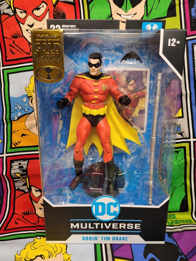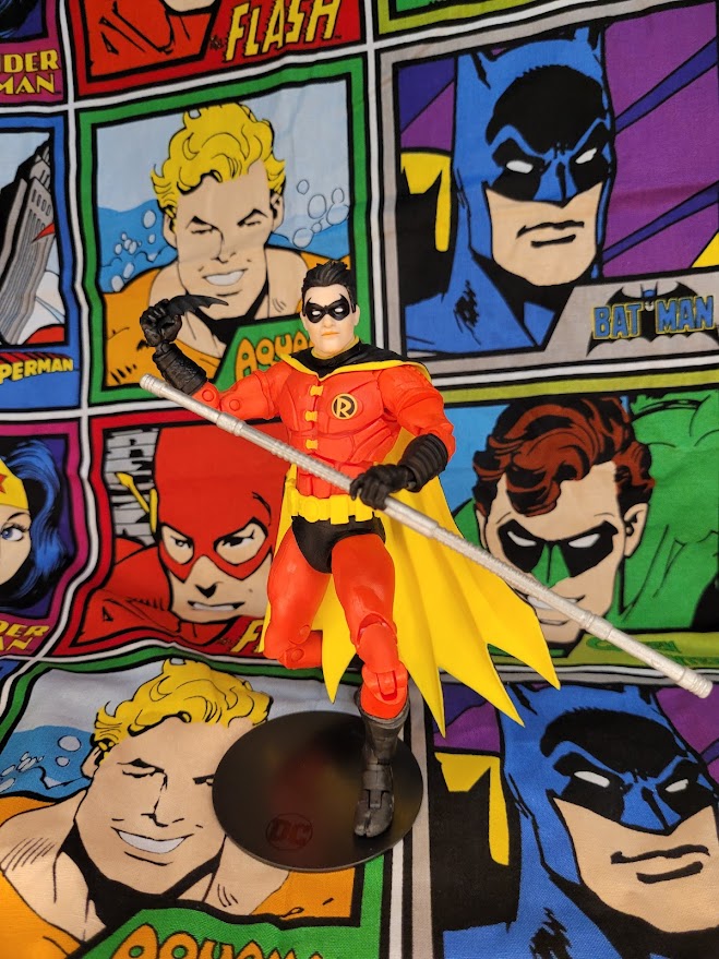 The figure is an Amazon exclusive Gold Label figure. It features Tim Drake in his second Robin costume, the one that he creates in memory of his friend, Superboy. It’s essentially a red suit with black boots, gloves, and shorts over his full length pants. His mask is black and his cape is black with a yellow interior. While it isn’t the flashiest of Tim Drake’s costumes, it’s still a pretty good looking suit. Included with the figure is the standard black DC base, a collector card, a batarang, and Tim Drake’s bo staff.