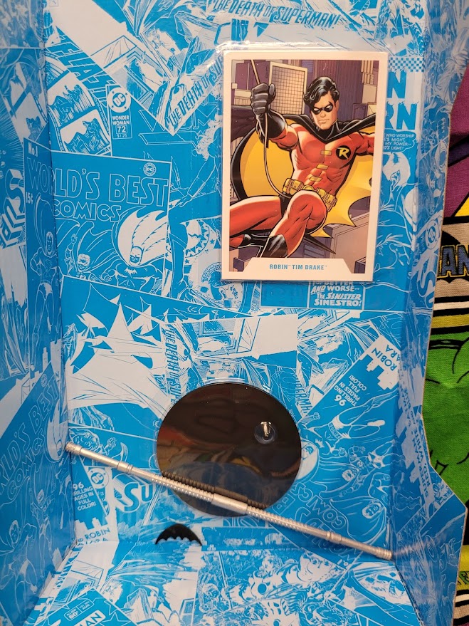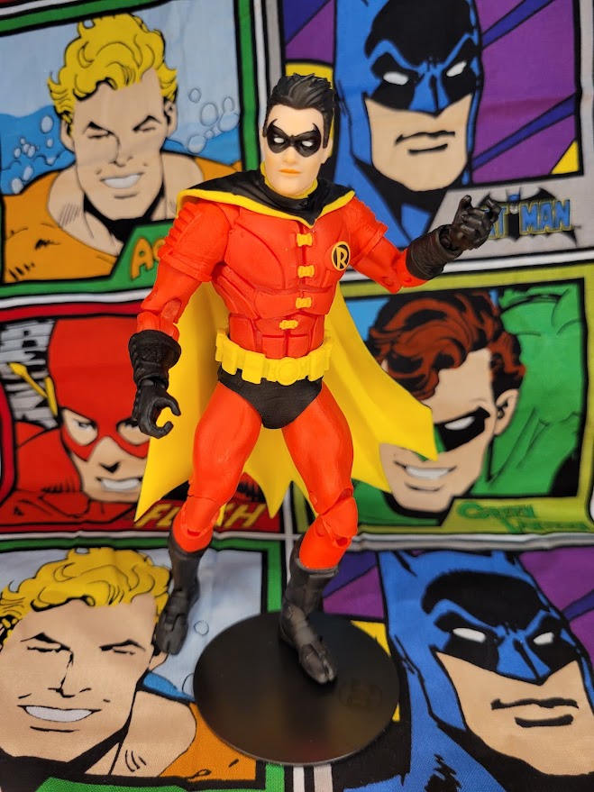The figure is an Amazon exclusive Gold Label figure. It features Tim Drake in his second Robin costume, the one that he creates in memory of his friend, Superboy. It’s essentially a red suit with black boots, gloves, and shorts over his full length pants. His mask is black and his cape is black with a yellow interior. While it isn’t the flashiest of Tim Drake’s costumes, it’s still a pretty good looking suit. Included with the figure is the standard black DC base, a collector card, a batarang, and Tim Drake’s bo staff.