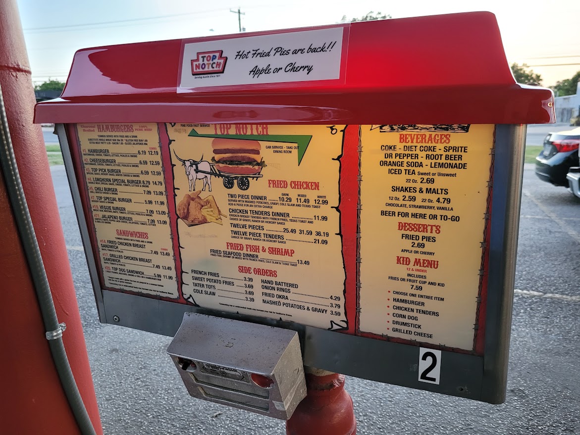 My secondary reason for checking out Top Notch was the food. I had a #2 cheeseburger combo. It was excellent. It had great flavor and just enough grease to appease my belly. Some of my relatives chose to eat fried chicken and it looked amazing. I plan on having it on my next trip to Austin.