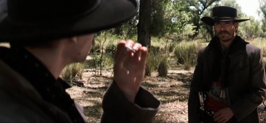In a continuation of the scene in which Curly Bill callously says, “Well, bye,” to Wyatt Earp. Johnny Ringo shows even less mercy than Curly Bill when he smiles and says, “Smell that, Bill? Smells like someone died.”