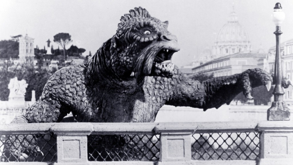 There really isn’t much of a plot to 1957’s 20 Million Miles To Earth. When a top secret U.S. Air Force spaceship crashes in the Mediterranean Sea, a young boy unwittingly frees a small creature from a protective case and sells it to a local doctor. The creature grows at a quick rate and in no time is larger than an elephant! It goes on a rampage across Rome while the U.S. military and local Italian police officials attempt to capture it. Sure, there’s some mention of studying the creature’s biological makeup in order to create a breathing apparatus for explorers on Venus, but that’s not why we watch a film like this. We watch it to see the creature destroy things and, boy, it definitely destroys things!