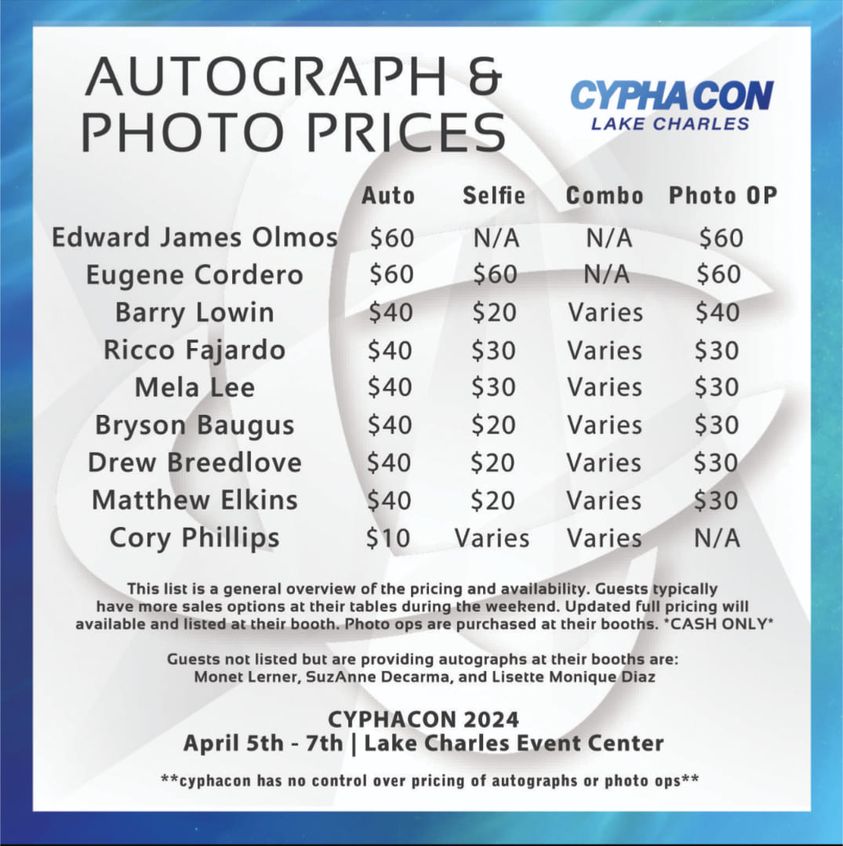 CyPhaCon a local event for me, so I always look forward to it each year. Below are a few more guests and some pricing information which is subject to change. Make sure to come by my table and say howdy!!!! See you this weekend!