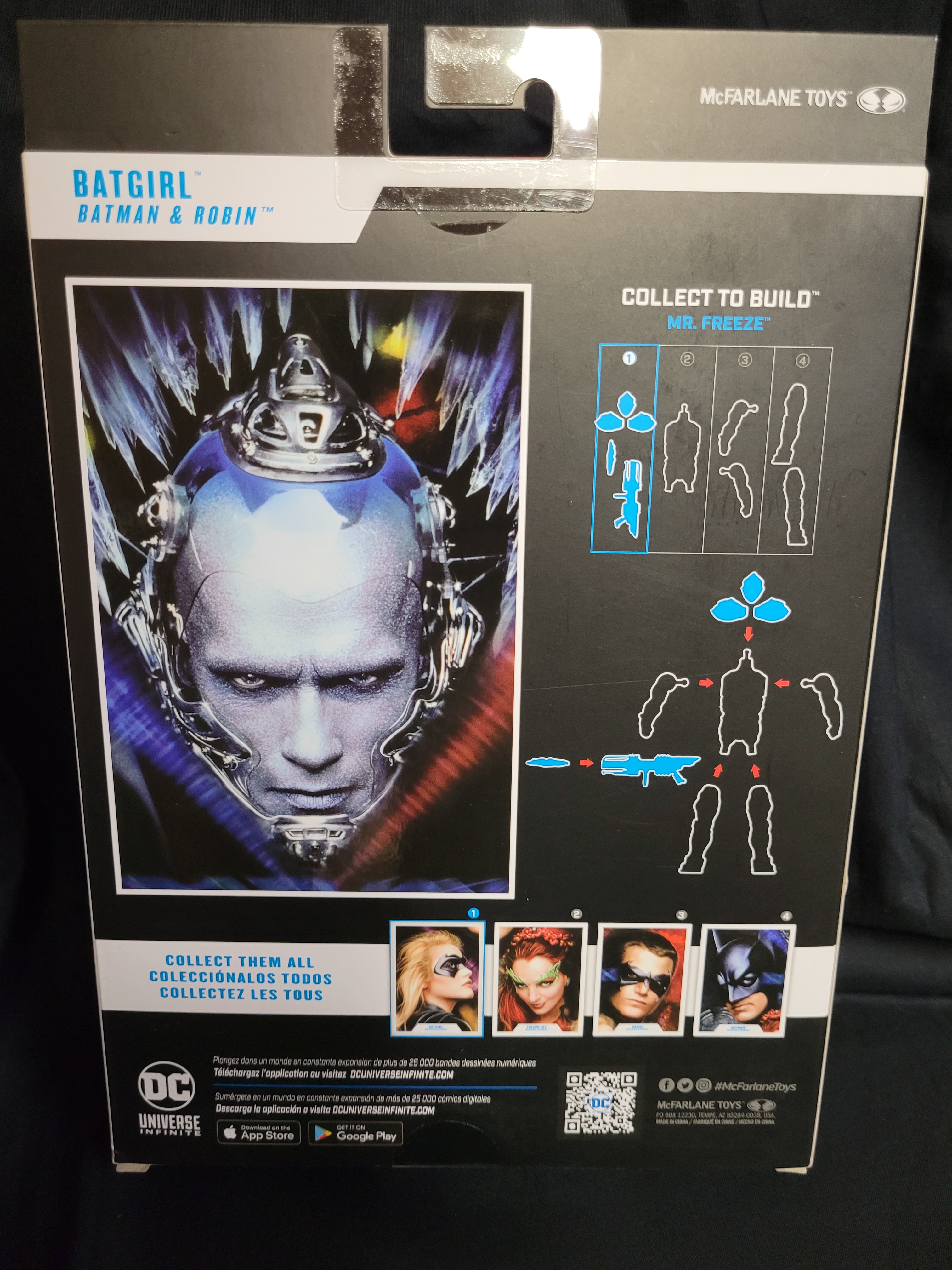 Although the 1997 Batman & Robin film is one of my least favorite films in the DC Universe, I have to admit that I really, really liked the costumes and some of the characters. One of the characters that I really enjoyed seeing on the big screen was Batgirl/Barbara Wilson, portrayed by Alicia Silverstone. McFarlane Toys recently released a four figure collection based on characters from the film that includes Batgirl, Poison Ivy (Uma Thurman), Robin (Chris O’Donnell), and Batman (George Clooney). Collecting all four of the figures allows you to assemble the Mr. Freeze (Arnold Schwarzenegger) Build-A-Figure. Batgirl is the first figure in the set. Let’s take a look at her.
