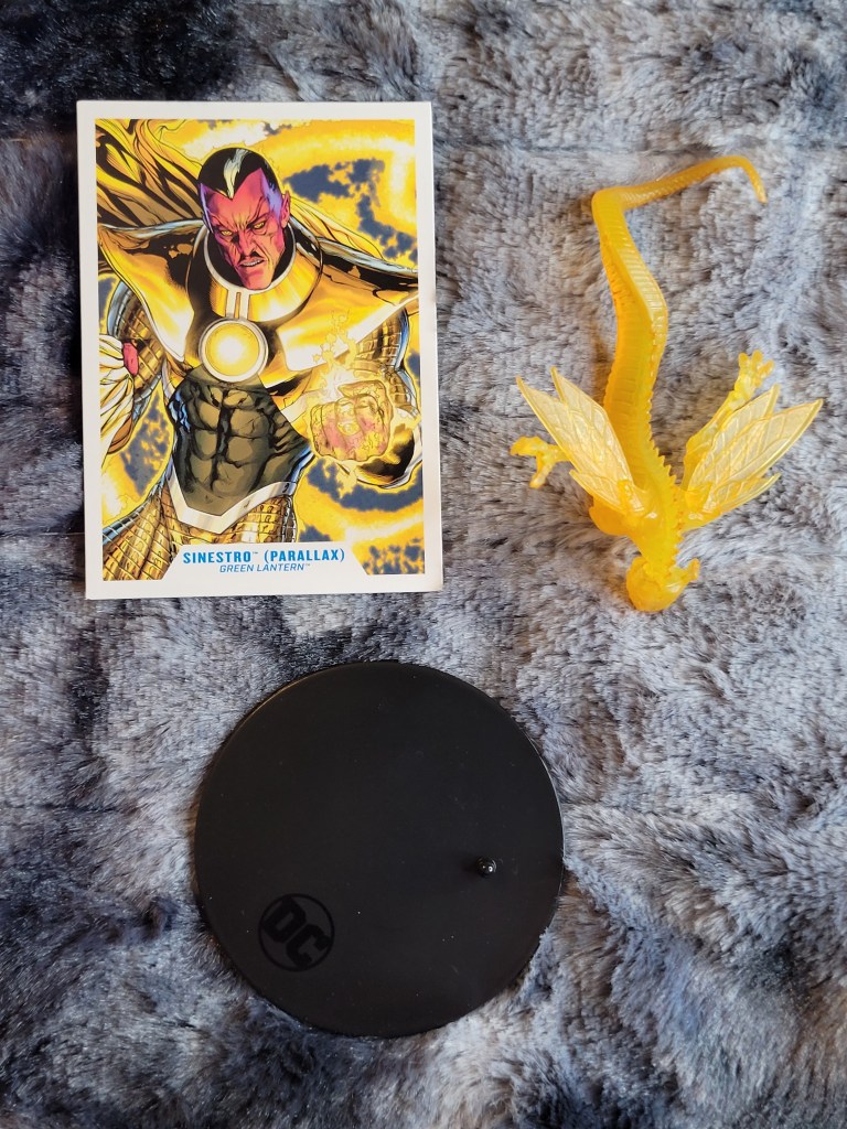 Aside from the paint applications, which are composed of pink, black, and white on a gold base, and Sinestro’s head, there aren’t any differences between the Hal Jordan version and Sinestro’s version of Parallax. Sinestro does come with one lone construct, a yellow Parallax construct, but that’s it for accessories. He does come with the token base and collector card, but nothing else.