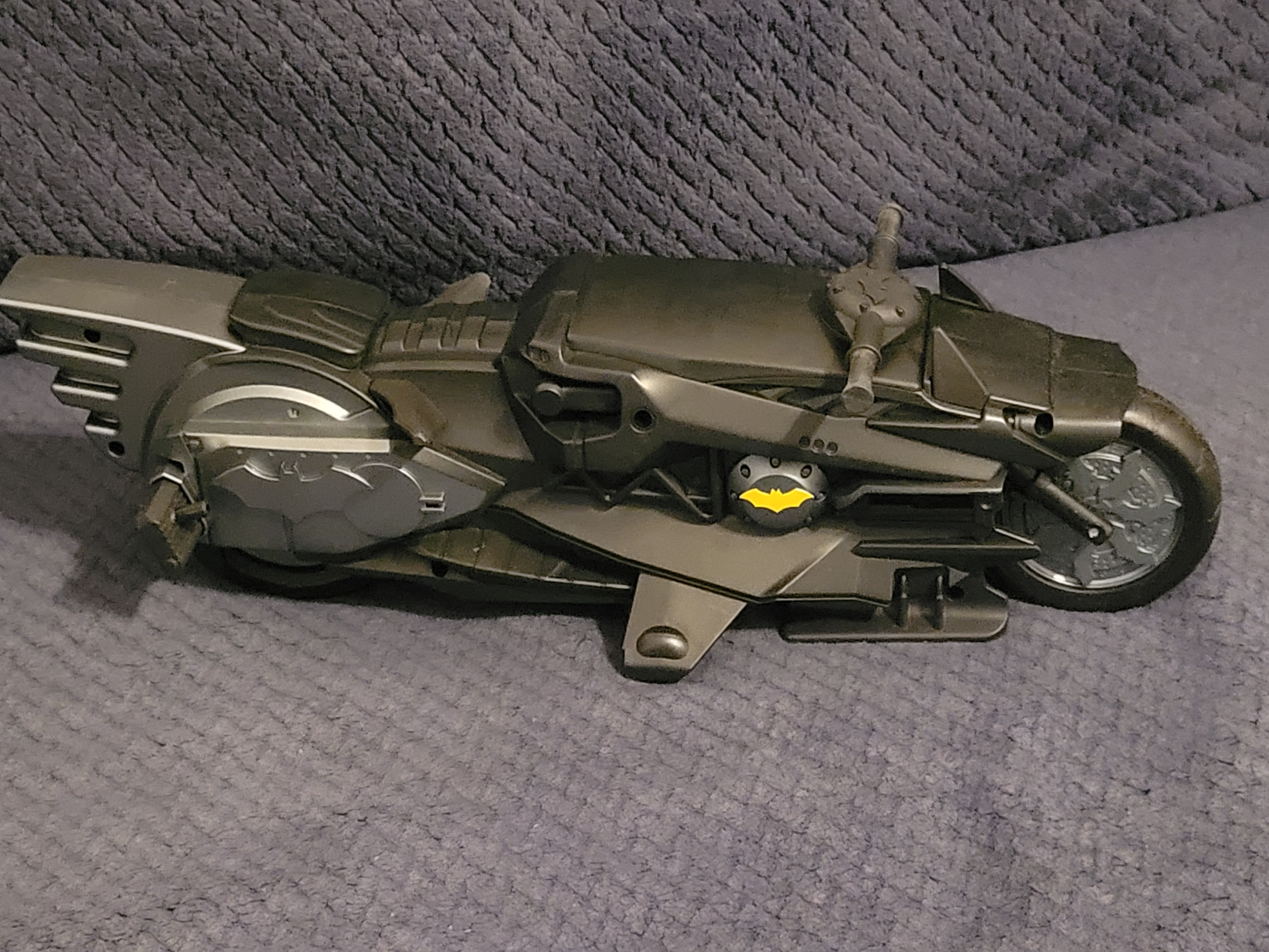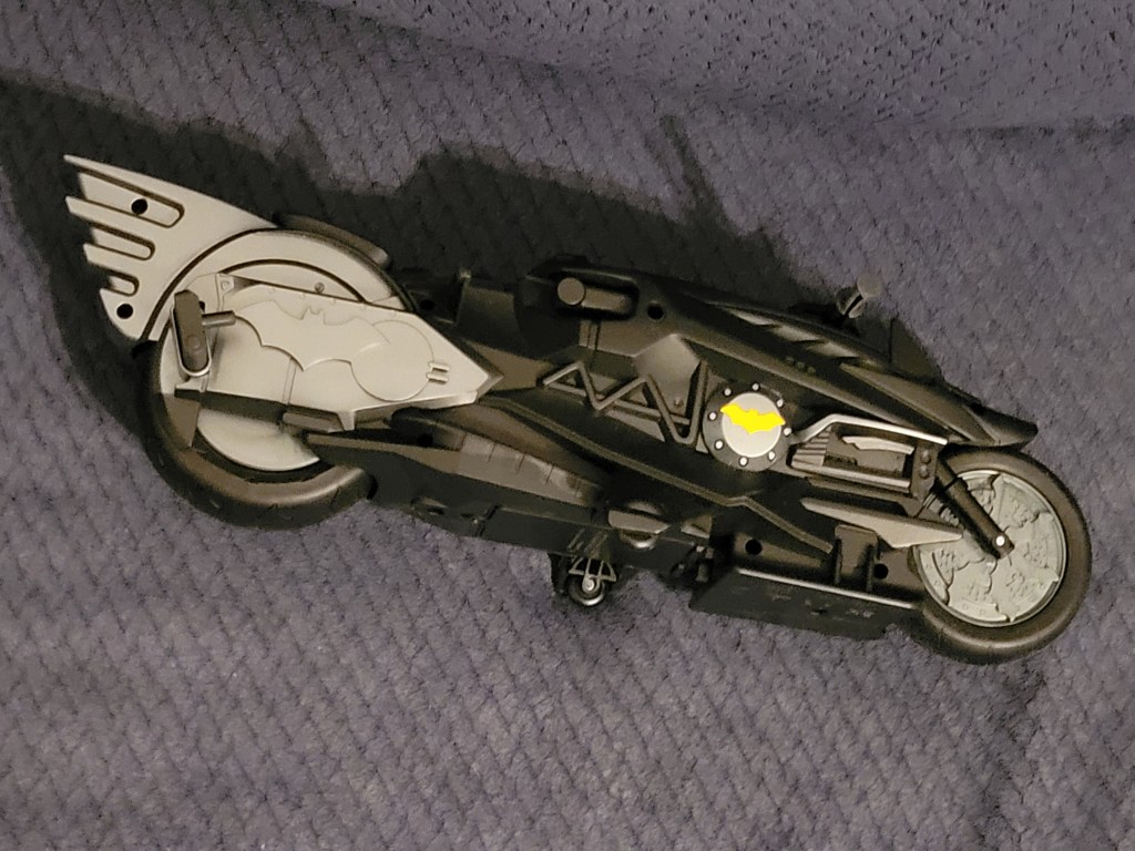 The Batman figure can be placed directly on the bike. It’s a pretty tight fit and can be a tad difficult to get Batman in place, but once you figure out his positioning, he stays put. His arms have loose joints which allow Batman’s arms to shift with the turning of the bike. The bike will also hold other twelve inch figures, but without loose arms, it will be difficult to turn the bike.
