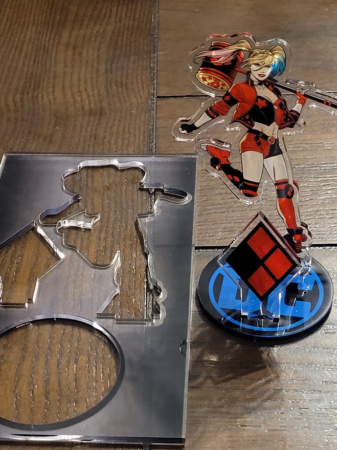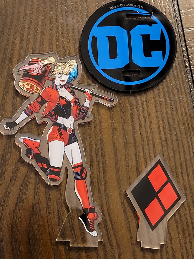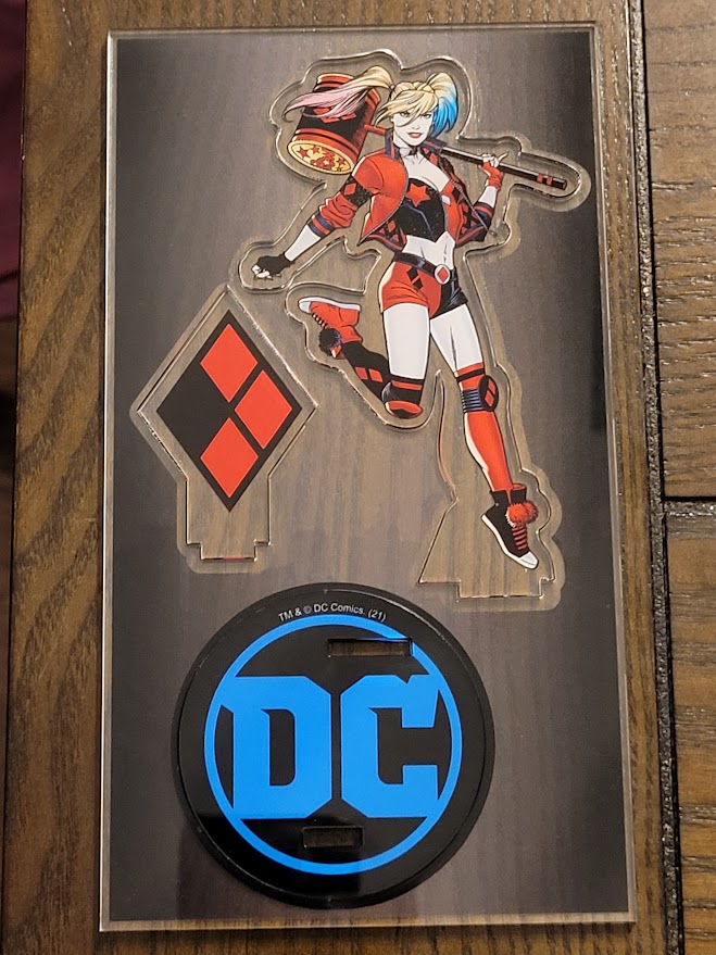 This four inch statue looks amazing! Made of durable acrylic, it comes on a single sheet and is punched out into three pieces. Harley makes up one piece, a harlequin diamond is the second, and the final piece is a DC Comics logo base. The diamond and Harley statue fit into the base.