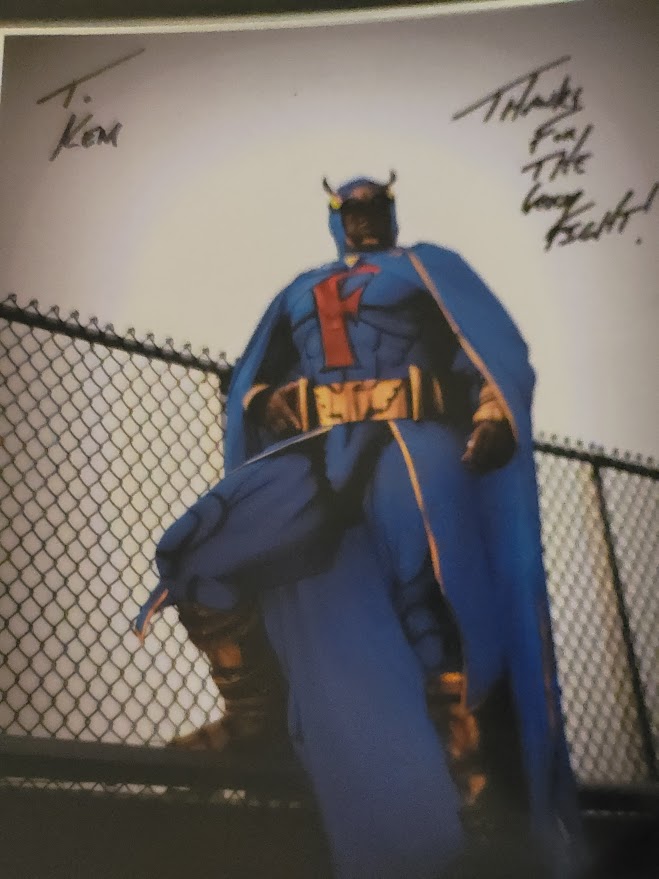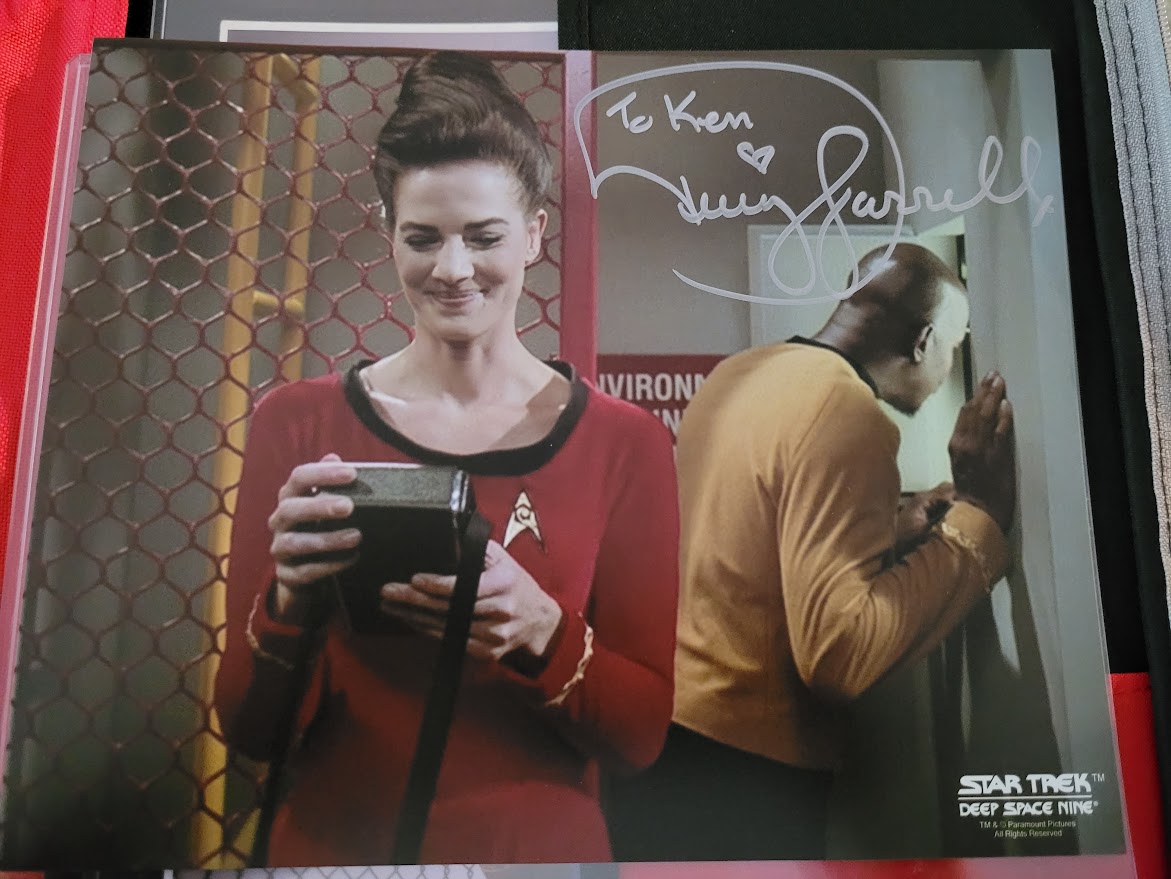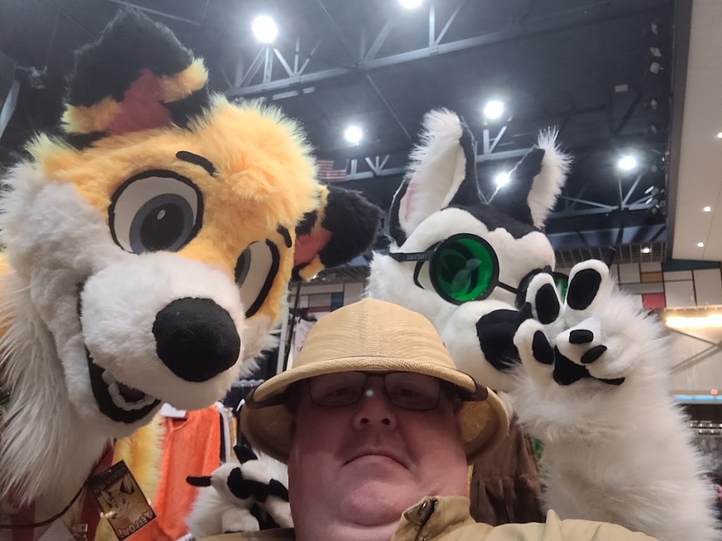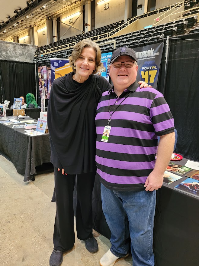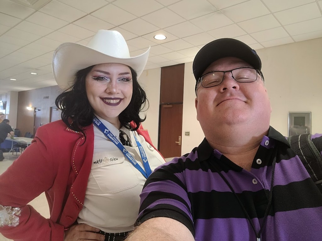 When Sunday rolled around I arrived at CyPhaCon fully caffeinated and ready for more fun. As usual for most conventions, Sunday was a bit slower. Despite this, my Bigfoot On The Big Screen panel featured my largest Sunday crowd ever for CyPhaCon. I visited the gaming area that featured board games, video games, and the weekend long eSports event. I played a few classic games like Galaga and then headed to the vendor area to meet the wonderful Terry Farrell from Star Trek: Deep Space Nine and the sitcom, Becker. While I didn’t say anything to her, I have to admit that she is still a gorgeous lady! She was so very kind to me and even took one of my stickers (Pinhead from Hellraiser) for her tumbler! After chatting with her for a good amount of time, I ventured back up to the LCFF table and visited with a number of people including the wonderful (and really buff) Knightmage Cosplay. He was “decked” out as Gambit! I picked up a print of Knightmage as Blue Falcon. I also caught up with my friend, Kat, who did a brilliant job of running the cosplay contest. She cosplayed Jupe from Nope.