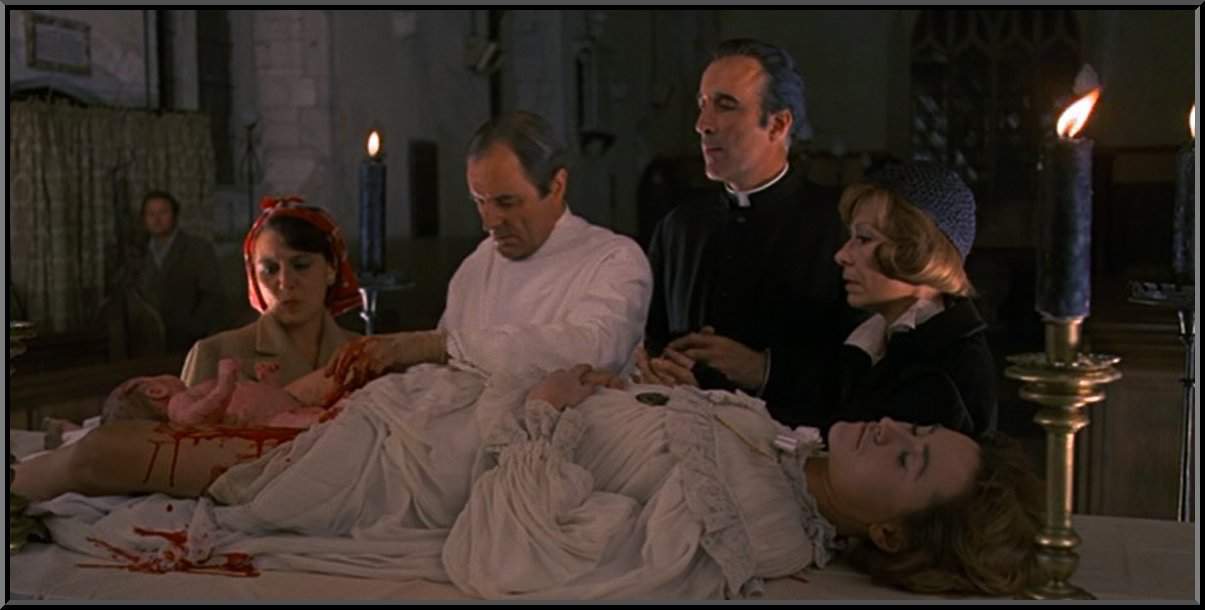 Of special note is the performance of fourteen year old Natassja Kinski. She played a character that was eighteen in the film and she does a fine job. With that being said, I want to mention an extremely scandalous scene that occurs near the end of the film. As I’ve already stated, Kinski was only fourteen when this film was shot and she appears in a full frontal nude scene. She is meant to be seducing Verney but, at least in my opinion, the whole scene could have played out just fine without the nudity. There are a couple of other nude scenes in the film that should be noted. One involves the aforementioned demon baby “entering” young Catherine and the other involves a Satanic orgy that shows plenty of sex but almost no nudity. Viewers will get to see the backside of Christopher Lee’s double, but that’s about as much flesh as any man shows in the film. All of the scenes involving nudity are meant to make the viewer uncomfortable and they definitely did that for me. I mention this mainly because the scenes, especially the Kinski scenes, were considered scandalous and almost definitely would not have occurred in a film today.